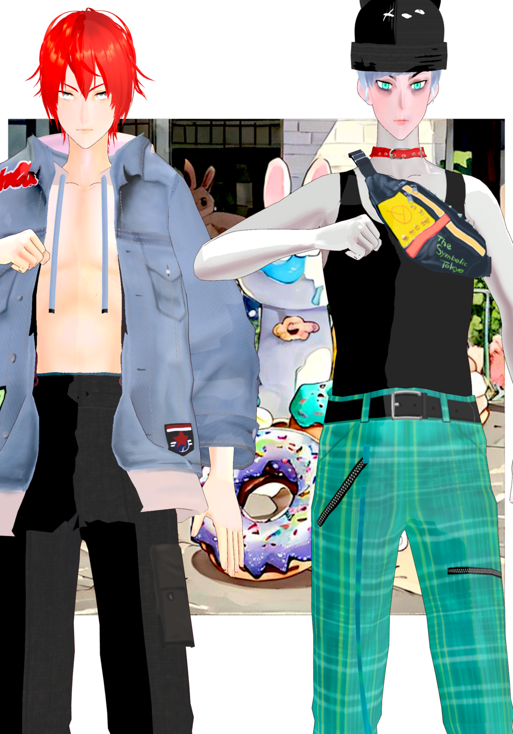 Harajuku Street fashion started in 80s. This male set is a complete street look, includes : Patches Denim Hooded Jacket, Punk Plaid Zipper and Straps pants, Symbolic Tokyo shoulder fanny pack, Cat face beanie, Black Doc Martin boots, Stripped ripped sweater, and red Punk Dog Collar Choker. Even though it's a male set, would look good on females too. 🐰Jacket can be worn alone or with other tops as seen in picture